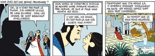 Tout ce que dessinent Kerascoët est une réussite. Derrière ce nom, se cache deux auteurs au talent incroyable et complémentaire. Aidé par le merveilleux scénario d’Hubert, on parcourt cette histoire avec bonheur. Le trio parvient à nous faire changer d’avis sur Beauté/Morue à chaque page. Entre ses caprices puérils – faire construire un château pour sa fille avec un lac, avoir des chevaliers servants...) et ses volontés humanistes (arrêter la guerre, rendre le royaume heureux...), le lecteur balance sans cesse entre exaspération et compréhension. Si la plupart de ses décisions viennent de son innocence, de son inexpérience, chaque réaction, chaque comportement se comprend.
