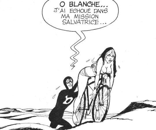 Blanche Epiphanie est une jeune fille orpheline de dix-huit ans, aux cheveux blonds et soyeux comme les blés, aux seins lourds et ronds et à l’ingénuité digne d’une enfant de trois ans. Autant dire que cela ne peut qu’exciter la concupiscence des hommes qui l’approchent. La plupart des personnages masculins du récit n’ayant qu’une idée en tête, porter atteinte à sa vertu de vierge effarouchée. Fort heureusement, Défendar, un super héros masqué à bicyclette veille sur elle, fondant tel un rapace sur sa proie (bien qu’un peu gauchement) et l’arrachant à chaque fois des griffes des gredins sans moralité. On suit les tribulations de la jeune fille, d’abord porteuse de chèques à Paris jusqu’aux confins de l’Afrique en passant par l’Orient mystérieux et envoûtant dans des aventures rocambolesques et improbables dans le plus pur style du roman-feuilleton du dix-neuvième siècle comme ceux d’Eugène Sue, Alexandre Dumas ou encore Gaston Leroux. Malgré tout, cela reste cohérent et l’on s’attache à ce style si particulier, usant de recettes narratives comme le questionnement direct au lecteur ou l’utilisation massive de superlatifs et d’adjectifs rendant l’action d’autant plus trépidante bien que légèrement désuète. Le dessin participe lui aussi de ce foisonnement propre à embarquer le lecteur avec des arabesques Art Nouveau qui bornent les phylactères, des décors rappelant la Belle Epoque et jusque dans les polices d’écritures toutes en courbes.