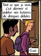 Eh oui ! Jouer du Nirvana, squatter les amphis, faire des soirées pizza, courir les filles, c'est ça la vie étudiante, ne cherchez pas plus loin ! Le cliché le plus énorme de l'album est très certainement ce syndicaliste en salopette, habillé comme un prolétaire du début du vingtième siècle : de la véritable caricature de compétition ! Bref, arrêtons là les sarcasmes, inutile d'insister davantage, vous avez saisi l'importance du folklore. On relève tout de même quelques points positifs. Il y a la référence, frontale mais tellement vraie, à la manipulation médiatique. Appréciable aussi, le personnage de Max, toujours aussi détestable et embourbé dans ses mensonges. Enfin, il y a le dessin de Christopher, agréable à parcourir et adapté au ton du récit.