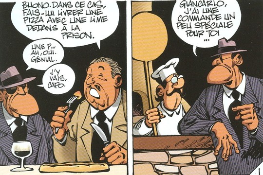 Alors, quoi de neuf dans ces nouvelles aventures du Capo (parrain) don Calimerone et de son assistant Vincenze Abruto ? Pas grand chose. Ce qui, selon qu'on aime ou non le comique de répétition, peut être vu au choix comme une tare ou un atout. Il est donc toujours question de pieds coulés dans le béton, de stoïcisme, de misogynie et de pizzas (comme le titre l'indique). Globalement, les histoires longues s'en tirent mieux que les gags en deux pages : le tournage du Parrain 4 est assez