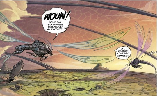 Avec une illustration qui devient de plus en plus habituelle (et donc de moins en moins intéressante), issue de l’influence grandissante du manga dans le trait européen, on découvre ici une histoire avec plein de bonnes idées. La couverture ne le laisse certes pas présager, mais ici, il y un véritable effort de construire un univers nouveau et logique. Les particules élémentaires qui servent à la construction de tout les éléments de la ville, la croyance religieuse tournée vers la science et l’image suprême d’un Docteur disparu, les combinaisons de vol, les puces sous la peau… Bref, un très bon cocktail de base pour une histoire de Science Fiction.