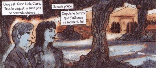 Le dessin est aussi compliqué à suivre. Pourquoi ce parti pris d’alternance d’ambiance bleutée, puis orange-rouge. Le trait n’est pas parfait, loin s’en faut. On passe d’un trait clair au début à un trait plus grossier peu à peu, comme si il y avait une volonté de mettre le lecteur dans le brouillard. Cependant, le récit reste lisible et vous reconnaissez les personnages. C’est déjà un bon point. Et une case m’a particulièrement marqué, page 19, rappelant quelques tableaux de grands peintres.