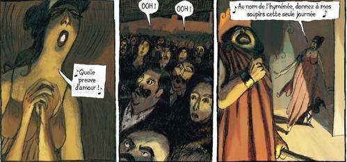 DR.Cet album est l’adaptation d’un roman éponyme de Gaston Leroux qui a aussi écrit le célèbre Le mystère de la chambre jaune. Dans un style éloquent et avec beaucoup de noirceur, Christophe Gaultier signe ici un bel album. Retranscrivant avec talent les émotions des personnages par des visages peu marqués mais qui sont paradoxalement très expressif, le scénariste-dessinateur donne vie à son album faisant-fi des détails, le dessinateur du loup-garou de Solvang ou Donjon Potron-minet-83 suggère plutôt les atmosphères et emmène dans le bal des sentiments entre Ingrid Daaé, Pierre de Chagny et le fantôme de l’opéra. Deux hommes, enfin un homme et un fantôme pour une femme. Si le premier est un amour de jeunesse, le second a une emprise presque surnaturelle sur la chanteuse et est presque son pygmalion. Il en a fait une artiste incroyable, lui a donné une force incroyable à sa voie comme s’il l’avait envoutée. Christophe Gaultier semble avoir le style idéal pour ce genre d’histoire alliant fantastique et thriller. Son dessin sombre sied bien à l’ambiance noire qui peut-être associée à la mort (et le compliment s’adresse aussi à Marie Galopin qui a fait les couleurs de l’album). Le trait épais de dessin donne une profondeur supplémentaire et son imperfection accentue la tragédie.