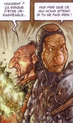 Il ne vous rappelle personne, le papy ?érigé en héros quatre imposteurs à la personnalité attachante, escrocs débrouillards et pas dépourvus de panache, afin de les opposer au sérieux de la quête qui leur est confié. Evidemment, on souhaite que les véritables "fléaux d'Enharma" montrent leur museau dans un tome futur, afin de mettre dans l'embarras la fine équipe... En attendant, on assiste à un premier tour de piste plein de figures imposées réussies : quelques combats éreintants contre de grosses bestioles pittoresques, une indispensable scène de nu pour maintenir éveillé... Le graphisme chargé de Créty trouve un sain équilibre entre le réalisme et la caricature (du côté des architectures, on peut regretter néanmoins un certain manque de fantaisie), tandis que les couleurs varient les ambiances régulièrement, passant de la rouge chaleur des premières pages à la glaciale emprise des dernières. L'album est suffisamment satisfaisant pour ne pas faire figure de simple introduction (ce que les premiers tomes de saga ont souvent tendance à être), mais titille clairement la curiosité, et laisse augurer une suite plus épanouie.