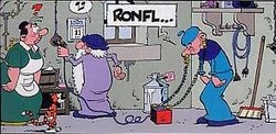 Evidemment, tout cela est bien beau mais après le contenant, le contenu est-il à la hauteur de l'événement. Il ne sert à rien de tourner autour du pot, et appelons un chat, un chat (ici, c'est Raoul !). C'est un bon album. Nous avons quelques histoires courtes de quelques pages ainsi que des gags sur une page. On reste dans l'esprit de la série avec un disciple toujours aussi fatigué, le chat Raoul qui nous agrémente les cases de ses réflexions et de son vécu (« J'en ai vu pas mal, des vitrines, dans ma vie »), Mathurine, la cuisinière ( attention, c'est une grosse femme et pas une invention de Léonard !) et bien évidemment Léonard. Et tout cela serait incomplet sans ses inventions extraordinaires, voire anachroniques. Dans le désordre, on trouve l'hydravion, le bateau de croisière Titanic, les détachants pour les taches de métal, d'origines chimiques, végétales ou animales, la DHEA, le frigo intelligent, la psychanalyse et j'en passe. ..