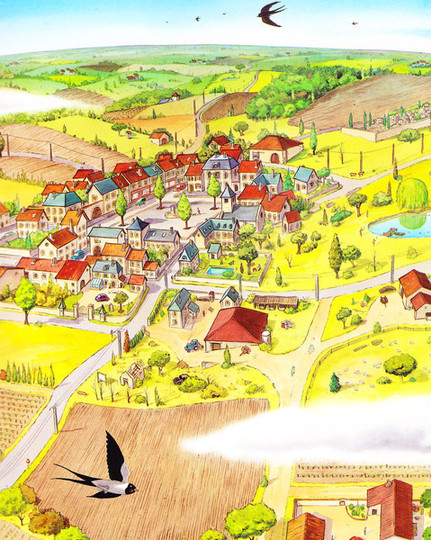 Ici, le décor n’est cependant pas vraiment onirique. L’action se déroule dans un petit village de France appelé les Bombinettes, caricature du village rural que l’on pourrait retrouver dans les dessins de Sempé. Sans ressembler à rien de précis, il est pourtant l’archétype dans l’inconscient collectif du bled rural typique et une vue d’ensemble en ouverture de l’album plonge d’emblée le lecteur dans cet univers faussement idyllique et coloré. En effet, sa tranquillité en sera perturbée par