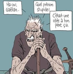 Vieil hirsute, qui ne parle jamais à sa famille, on l’écoute pourtant raconter ses histoires fantastiques. Il pense que c’est le moment de livrer ses secrets, ce dont ne semble pas être d’accord Gaëtan qui doit trouver que son grand-père est un vieux con (ce dont il n’a pas tout à fait tord). Et inversement, Miguel prend son petit-fils pour un jeun con.