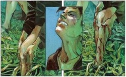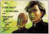 Dans les mêmes cadres - la collection Aire Libre et les paysages de l'Amérique du sud - Emmanuel Lepage nous revient avec un diptyque, dont les deux franges sont parues en 2004 et 2006. Si la plupart des diptyques parus chez Aire Libre forment une histoire complète, simplement articulée en deux tomes pour des questions éditoriales et de suspense (Houppeland, Le sursis, Le vol du corbeau, L'enragé...), Lepage, avec Muchacho, donne naissance à un diptyque qui a du sens. Le diptyque prend pour centre un personnage principal, Gabriel de la Serna, mais chacun des deux tomes nous le fait découvrir sous un aspect différent. La couverture du premier tome nous présente un jeune séminariste androgyne, retranché dans la pénombre d'une église. La couverture du deuxième opus, reprend le personnage dans le même plan rapproché. Le visage de Gabriel a pris en confiance, il est celui d'un jeune homme déterminé, abîmé. Notre séminariste devenu guérillero voit le décor derrière lui évoluer ; il est maintenant en pleine forêt tropicale. Les deux couvertures sont tout à fait symboliques de la scission entre les deux albums : l'histoire se déroule en continuité, mais d'un tome à l'autre, le personnage principal se révèle dans une nature différente, les thèmes abordés ne sont pas les mêmes.