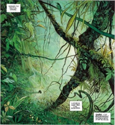 Le deuxième tome, plus long d'environ vingt pages (de 72 à 90), place Gabriel dans une autre communauté, plus restreinte, celle de guérilleros en mission. L'album s'introduit par un long chemin de croix du personnage, au centre d'un paysage magnifié. Les pages suivantes donnent peut être un peu trop dans l'archétypal, et c'est bien le seul défaut que l'on peut trouver à Muchacho. Lepage crée un groupe de personnages aux caractères bien trempés, qu'il fait se dévoiler très vite pour bien les fixer dans l'esprit du lecteur. Une empathie à développer au plus vite, en vue des épreuves que les personnages traverseront ensuite. Les corps marqués par l'humidité, le climat de la forêt tropicale et ses paysages fabuleux : les lieux sont propices à l'explosion du talent de Lepage, qui ne manque pas de nous délivrer des planches aux couleurs splendides. Le groupe de guérilleros a en charge un prisonnier américain, Mac Douglas, et une discussion du groupe avec lui permet à Lepage de s'exprimer un temps sur le thème de la révolution. D'un coté, le réalisme cynique (« Le monde est toujours ainsi et il n'en a jamais été autrement ») et de l'autre, l'idéal révolutionnaire, l'utopie du changement (« Vous n'éteindrez jamais l'espérance »). C'est la décrépitude qui gagne le groupe au fur et à mesure de son enfoncement dans la jungle, décrépitude que saisit très bien Lepage, nous présentant une réelle descente aux enfers, visible autant dans l'évolution de l'intrigue que dans celle du graphisme. Autres thèmes traités, ceux brûlants de la légitimité (Gabriel est le fils d'un bourgeois proche du pouvoir dictatorial) et de l'homosexualité (l'amour entre hommes, encore plus camouflée dans les années soixante-dix qu'aujourd'hui, voir notamment le film Brokeback mountain).