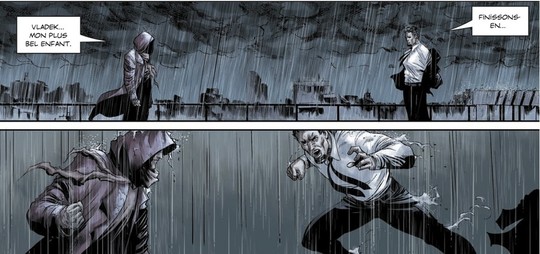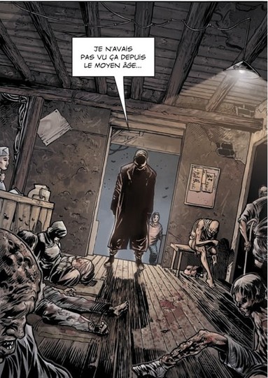S’appropriant le personnage du vampire le plus famélique qui soit, les auteurs montent une histoire attrayante qui se lit comme un blockbuster hollywoodien. Découvrant trois factions, réparties à trois endroits différents du globe et qui seront amenées à se rencontrer dans un final musclé, amené par un développement énergique, on a l’impression de s’asseoir devant une superproduction, boostée à coups de millions de dollars. L’aspect tentaculaire et labyrinthique du bidonville renforcera d’ailleurs l’impression que des gros moyens ont été débloqués pour ce film… pardon cette BD. Et c’est en effet assez malin que de ne pas hésiter à utiliser les énormes capacités qu’autorise ce média pour faire du grand spectacle, car, pour peu que le dessinateur s’y entende, cela marche assez bien. Ici, à plusieurs reprises, on a le sentiment de lire un film d’action, et comme souvent dans ces cas-là, on veut savoir comment le méchant va mourir, et c’est pour cette raison que l’on tourne les pages.