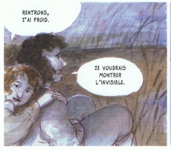 Un album aux couleurs tour à tour pâles (pastelles) et violentes (à la dominante noire et rouge), rappelant souvent les clairs obscurs de Rembrandt. Des figures abimées, laides, des traits s'éloignant clairement de l'univers de la bd, comme si chaque planche était un tableau, chaque vignette une illustration. C'est avec simplicité qu'il va nous faire avancer dans le monde sombre du peintre.