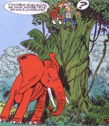 Fantasio aux prises avec des éléphants rouges (non, pas roses, rouges). Exotique mais pas renversant, Tembo tabou a été réalisé pour Le Parisien (qui s'appelle encore à l'époque Le Parisien Libéré) en 1958 : Greg est là aussi au scénario, tandis que Franquin se fait assister de Roba pour les dessins. Celui-ci a créé Boule et Bill la même année, et ne crache pas sur la reconnaissance que peut lui apporter de bosser sur une série aussi prestigieuse que Spirou. Mais sorti de l'amusante énergie graphique que procurent les éléphants rouges, l'épisode se révèle assez anodin. Le Marsupilami et la présence de plantes carnivores relèvent agréablement le niveau, néanmoins.