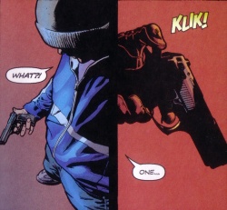 A encaisser, Wanted est un catalogue de ce que le parent responsable ne souhaite pas trouver dans le Babar de son marmot : vulgarité verbale à base de déclinaisons de ‘fuck' et de ‘asshole', vulgarité visuelle sous toutes ses formes jusqu'à la présence d'un personnage appelé Shit-Head (constitué des excréments des 666 personnes les plus maléfiques du monde), incitation à la révolte et à la violence... Mark Millar s'en est donné à cœur joie, écoutant néanmoins les conseils de son dessinateur qui parvint par exemple à le dissuader d'ouvrir le premier tome sur une image de sodomie ! Une telle débauche d'excès dans un univers de super-héros (ou plus exactement de super-vilains, les super-héros étant tous canés depuis vingt ans) peut sembler aussi gratuit qu'immature, et évoquer la noirceur complaisante et parfois un peu stérile d'un Spawn. Mais les auteurs de Wanted sont plus malins que leurs provocs exutoires ou leurs hommages ostensibles aux classiques du comics (amusez-vous à reconnaître les parodies plus ou moins directes des personnages Marvel et DC, dans les protagonistes principaux comme dans les figurants). Leur histoire tient la route, leur personnage aussi, et la cruauté de son parcours fait aussi mal à son karma qu'au cœur du spectateur. Jusqu'au final in-your-face en forme de pied de nez.