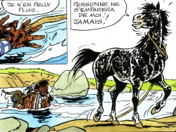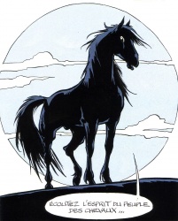 lendemain pour remettre ça. Mais au matin, point de Petit Tonnerre. Selon le témoignage des autres chevaux (c'est quand même bien pratique de pouvoir leur parler), le jeune poney se serait enfui à la faveur de la nuit, sans un hennissement d'au revoir. Yakari va bien tenter de suivre son ami, mais la poursuite l'emmène trop loin de son campement et il doit abandonner. Nous nous concentrons alors sur l'aventure du petit poney et l'appel mystique qui va le pousser, lui et plein de ses congénères, à passer des épreuves sous l'inspiration du grand esprit équin. Cette aventure porte en elle une philosophie mystique de l'accomplissement d'un devoir pour aucune autre raison que l'inspiration divine, qui se traduit alors par des épreuves initiatiques de bravoures censées témoigner d'un respect envers les anciens et les traditions. Difficilement explicables, ces actions revêtent un aspect noble dont la poésie, sublimée par l'inutile danger auquel s'exposent les impétrants, renvoie à tout un système de valeurs, que la culture populaire a attribuée aux amérindiens et aux fondements animistes de leurs croyances.