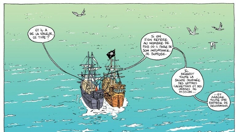 Et c’est en 1999 que les auteurs démarrent le récit. On suit l’échec de la sonde américaine Mars Climate Orbiter, pour ensuite se retrouver en 1794, en pleine mer des Caraïbes, et assister à l’abordage d’un navire par les pirates du capitaine Jacques. Parmi le butin, ils ramènent un botaniste et son drôle de trésor : un poids, une règle et un cube. Le scientifique réclame d’être liberé afin de se rendre en Amérique où il est attendu. Il a en sa possession les mètres étalon d’un nouveau système métrique universel. Fini le pouce, le pied et autre mesure incongrue, place au mètre, au litre et au gramme !