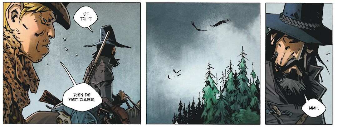 Olivier Bocquet prolonge le plaisir du premier tome avec Anlor aux dessins. Et ce n'est pas parce que les desperados sont en jupons, que la violence n'y est pas présente dans une sorte de jubilation "tarantinesque". Le dessin d'Anlor y fait des merveilles et les découpages donnent de l'énergie et du mouvement. Elle explose littéralement les cases. J'ai notamment un faible pour la page 15 qui va déstructurer complément les pages suivantes ou encore la double page 46-47 véritable cinémascope. Mais la dessinatrice sait aussi revenir à des séquences plus traditionnelles voire presque trop sages pour calmer le rythme.