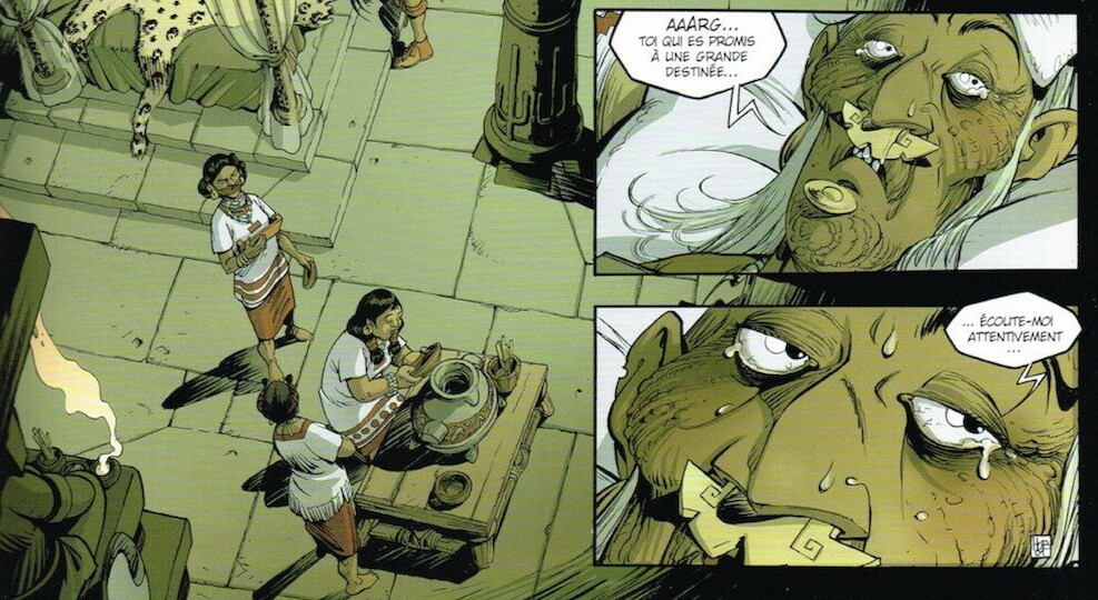 Hub exprime aussi assez clairement et simplement les nombreux conflits personnels qui opposent les protagonistes comme Tlilpotoncatzin, en pleine réflexion entre sauver sa fille ou remplir son rôle de juge dans une séquence que n'aurait pas renié un Hergé (voir p104).