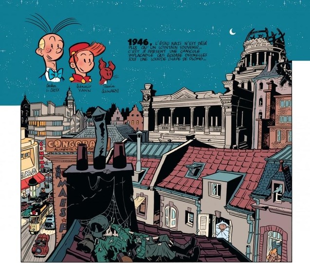 On retrouve donc Spirou juste après la guerre. De retour au new moustic comme groom, il soigne son chagrin – la disparition de la jeune juive Audrey en camp de concentration – dans les bouteilles. Devenu alcoolique, il n’est plus que l’ombre de lui-même. Il n’hésite pourtant pas à poursuivre sur les toits une femme-léopard qui a attaqué un client de l’hôtel, le colonel van Pragg.