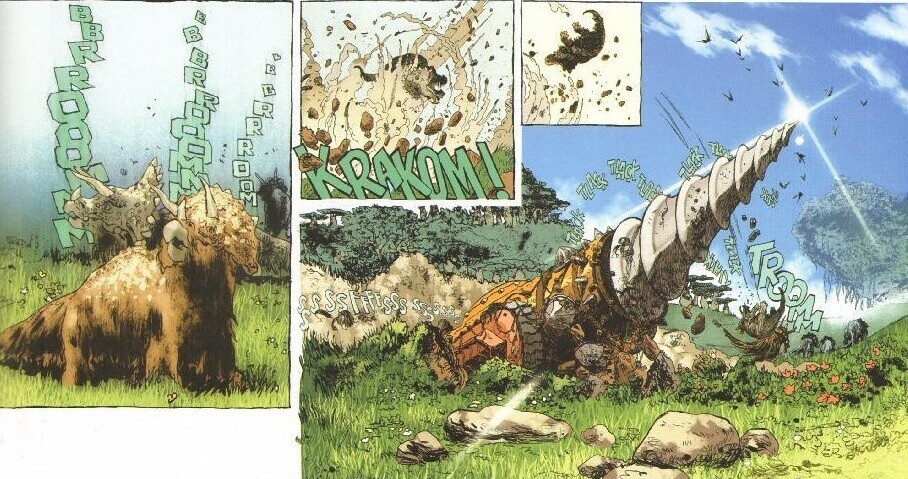 Dès la première page, on voit sortir un engin perforant la croute terrestre. Une sorte de triceratops va alors charger les deux conducteurs de l'engin sortis découvrir la situation. Et ils ne seront pas déçus. Après avoir échappé à cette charge, ils vont fuir des hyènes géantes, pour se faire enlever par des hommes-singes, puis par des gorilles. Les deux hommes, David Innes et Abner Perry, viennent d'arriver au cœur de la terre, sur le continent de Pellucidar ….