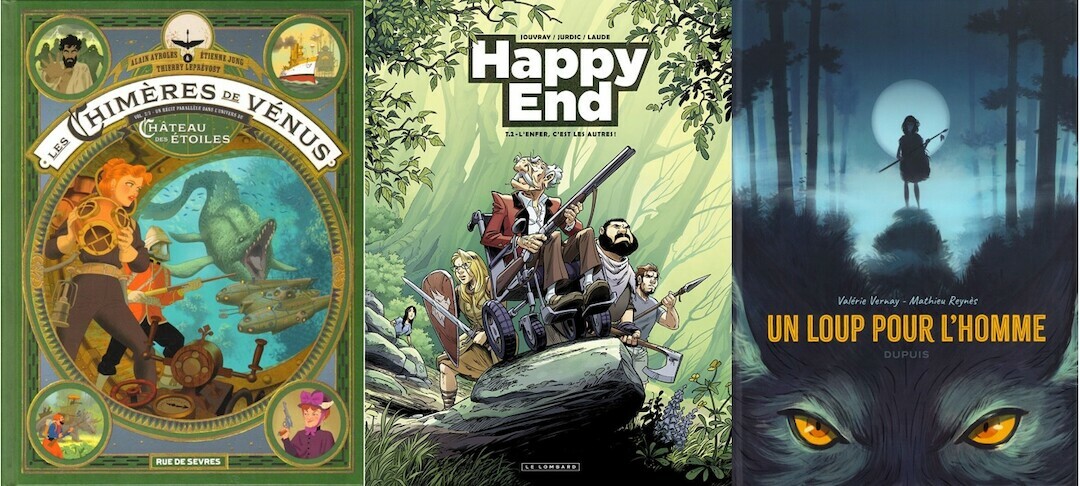 Les couvertures des 3 albums - © Rue de Sèvres - © Le Lombard - © Dupuis 2023.