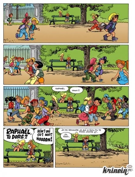 Et nous donc !...depuis trois tomes dans son rôle d'attaché auprès du jeune Raphaël, qui semble de toute façon bien jeune pour emballer les nanas. Un seul personnage, un seul décor (le square)... Les idées ont été toutes largement exploitées dans les deux précédents tomes, sans compter celles qui ont été essorées jusqu'à la dernière goutte dans les 18 épisodes précédents. Autant dire qu'il ne reste plus grand-chose ici pour amuser le lecteur, à part peut-être le titre coquin, que l'on peut prendre à l'envers comme celui du dernier Pierre Tombal. Ainsi, Le nœud du problème recèlerait un indice de la raison des déconvenues de Raphaël... Blague à part, si l'album pouvait regorger de perversités du même acabit, on serait prêt à accepter les dessins interchangeables et les recyclages d'idées périmées depuis plusieurs décennies. Mais une fois ouverte la couverture, rien à se mettre sous la dent, rien de plus excitant que de l'humour de papa distillé sans entrain par deux auteurs qui viennent pointer par habitude.