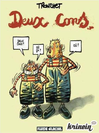 « C'est nuuuul ». Le genre de petites phrases que l'on prononce avec insistance et lassitude, le temps d'un soupir déçu. Voilà le triste effet produit par Deux cons, le dernier Tronchet. Un humour qui se veut désuet, mais qui s'enfonce si profond dans le ridicule volontaire qu'il ne parvient pas à susciter autre chose que de l'inconfort. Ce type d'humour a pourtant déjà fait ses preuves. Une chute minable, suivie d'un roulement de tambour bas de gamme, c'est toujours un bon moment. Et Tronchet a déjà, à de multiples reprises, fait la preuve de ses compétences en la matière (Les aventures de toi et moi). L'auteur sait créer des situations décalées, cruelles, caustiques, des personnages de très grande envergure comique. Mais ici, le récit s'enlise dans une lourdeur et une vulgarité (« Y'a un os dans ta bite ? ») palpables dès les premières pages. Les deux personnages principaux, Patacrèpe et Couillalère (reprise du titre d'une série publiée en 1998 chez Delcourt), sont deux andouilles qui échafaudent des théories farfelues sur la vie, les raviolis, les petites culottes et les raviolis. Les gags s'enchaînent et de nombreux clins d'oeil et phénomènes de rappel sont disséminés ça et là. Graphiquement, Deux cons se situe dans la droite lignée de l'évolution de Tronchet ces dernières années, avec une palette de couleur très nauséeuse, donnant dans des tons volontairement outranciers et un trait très épais. Alors que la plupart des bandes dessinées d'humour par séquence décomposent mathématiquement leurs gags en strips ou planches, Tronchet enchaîne les gags sans transition de contexte. Un gag peut commencer dernière case d'une page pour se terminer plus loin, au milieu du deuxième strip de la page suivante...
