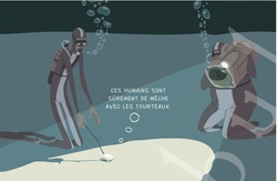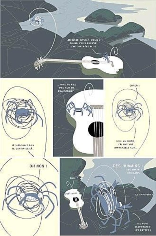 Ce fil naturel et simple le long duquel le lecteur est invité à se promener se fait alors aussi évident que la ligne droite que le crabe ne peut que suivre, en évitant de se poser trop de questions et en essayant de profiter de ce qu'il peut. Et en l'espèce on aurait pu tomber bien plus mal, car il faut dire que le sens comique de l'auteur est incroyablement communicatif, aussi bien au niveau des graphismes que du texte, allant parfois se loger dans les manifestations comportementales suscitées par la psychologie de ces crabes unilatéraux. Ainsi, en plus de vouloir connaître la suite des évènements, on est aussi motivé par la certitude que l'on va encore passer un bon moment.