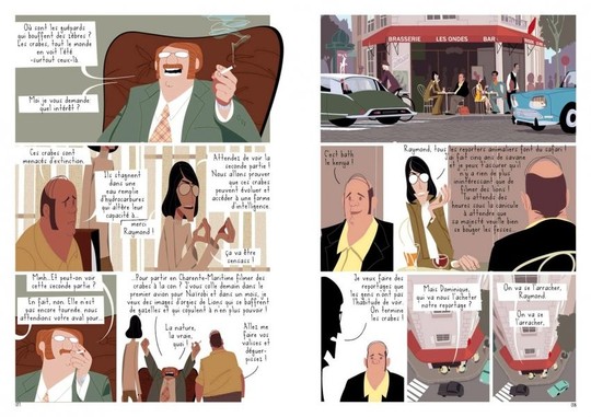 Grâce à ces petits personnages débiles, parfois capables de réparties cinglantes, dans cet univers où les tourteaux sont des caïds et les huîtres sont complètement connes, de Pins élabore de quoi occuper son lecteur sur 110 pages, avec un début de récit riche et bien articulé. Sur l'équivalent d'une dizaine de scènes, ce premier acte se conclut sur le même évènement qui terminait le court-métrage, à la différence que les raisons dudit évènement sont ici plus élaborées et plus comiques (enfin ça dépend pour qui). Ce final est d'ailleurs un point supplémentaire de croisement entre deux mondes, celui des crabes et celui des humains, qui ne cessent de s'influencer tout au long de l'album. Dans l'ensemble, ces recoupements et l'enchaînement des situations qu'ils provoquent démontrent un réel travail d'élaboration de l'histoire, au-delà du développement de l'idée de base. Et au final, tout cet agencement est si bien pensé et présenté qu'on ne se rend compte de sa pertinence qu'après la lecture, en repensant bien à l'histoire.