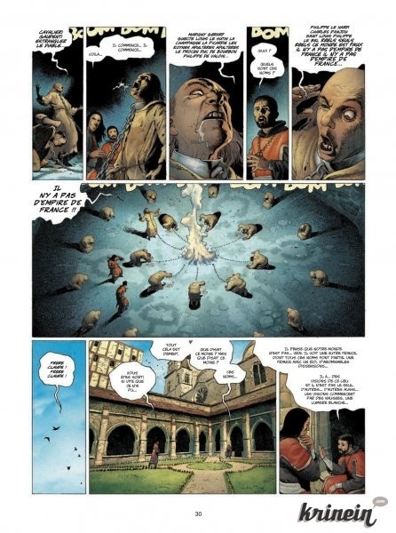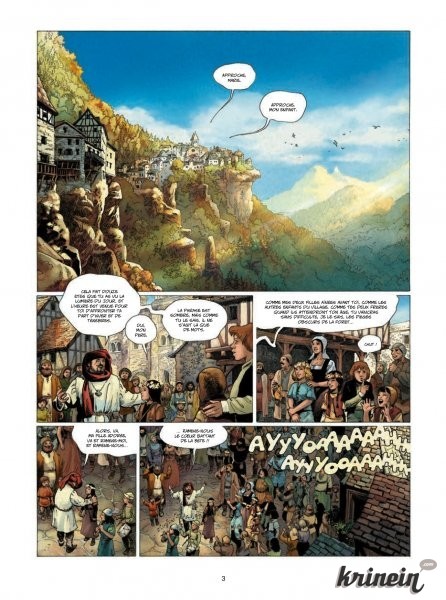 Femme à poignevendre comme l'initiation d'une histoire bien ficelée et captivante. Suivant les pérégrinations d'une jeune fille guerrière dans une France médiévale étrangement méconnaissable, ils rattachent progressivement au récit les personnages qui finiront par constituer la caste autour de laquelle il se développera. Ces derniers, non content d'être présentés avec fluidité, démontrent des attitudes et des comportements qui dénotent une psychologie travaillée et des liens relationnels compliqués, très convaincants. Loin de la sotte exposition fade du héros qui tatane avec style, les trois personnages principaux se débattent avec leurs doutes et leurs convictions, complexité qu'on rencontrait déjà dans le tome 8 de la Geste. Cette histoire vaste et active, sur fond de surnaturel et dotée de personnages creusés aux relations fouillées, jouit également d'un environnement qui, bien que familier, s'avère tout aussi étrange et complexe. Ce locus, et c'est un autre point positif, évolue au cours du récit, au-delà de la seule explication apparente distillée par la narration. Ainsi, des indices, plus ou moins gros, susurrent une réalité complexe, à la hauteur des personnalités en présence.