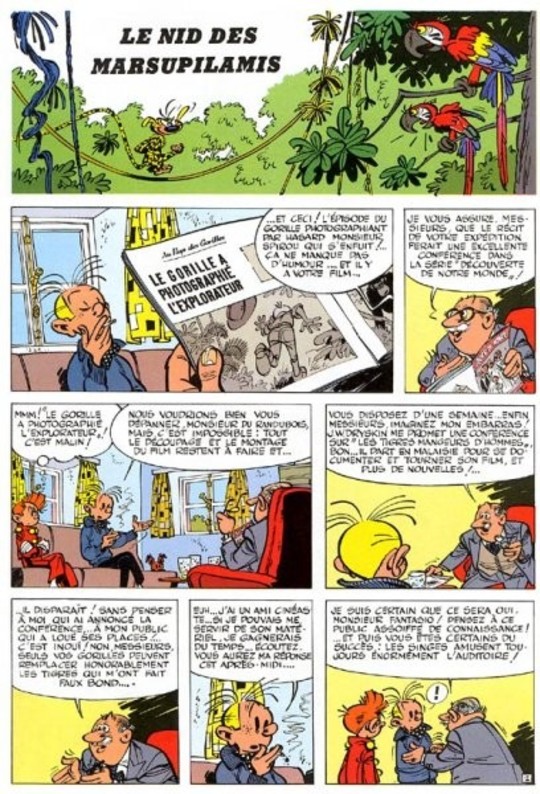 Fraîchement revenus de leur périple en Afrique, Spirou et Fantasio tentent d'organiser une projection du film qu'ils ont réalisé sur les gorilles. Mais ils sont coiffés au poteau par le reportage de la mutine Seccotine, qui s'est rendue en Palombie et a filmé... des marsupilamis sauvages ! Le fidèle compagnon des deux aventuriers n'est donc pas seul de son espèce, et ses congénères ont tous le même caractère en acier trempé. Durant 32 pages incroyables, le documentaire animalier de Seccotine va remplacer la traditionnelle aventure de Spirou : le marsupilami et sa compagne, anthropomorphes mais dotés d'une personnalité inimitable, tiennent la vedette sans une ligne de dialogue (autre que « houba houba » et « houbi houbi »), et se révèlent prodigieusement expressifs et attachants. Franquin, c'est bien connu, s'est toujours plus projeté dans le Marsupilami et dans Gaston, deux facettes de sa propre personnalité, que dans les plus lisses Spirou et Fantasio. Ceux-ci, en spectateurs attendris, se contentent de rendre hommage à leur confrère Seccotine, qui conduit son scooter comme une patate (ah, les femmes au guidon !... ce stéréotype valut à l'auteur quelques remarques amères) mais a su capter la magie des marsus dans leur habitat naturel... Un récit unique, classique indispensable de l'histoire de la bande dessinée.