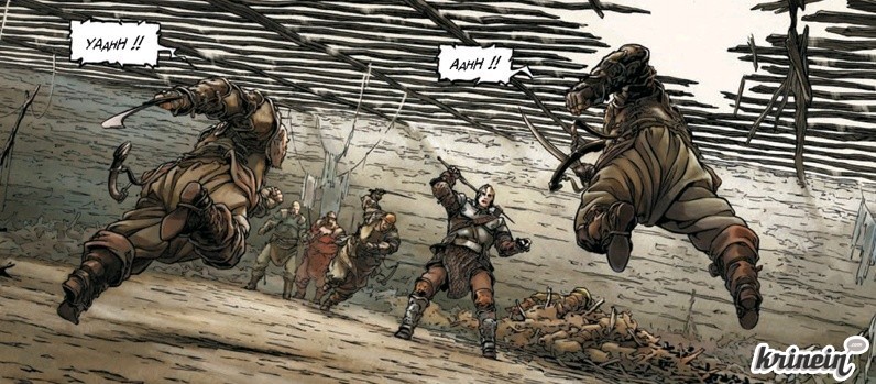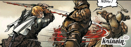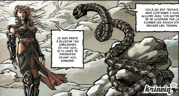 Cela veut dire qu'elle est chaude ? Laci de son côté, n’est pas toujours à son aise. Si les combats ont un panache certain, les plans larges sont terriblement hésitants et il devient difficile de reconnaître les différents protagonistes tant le niveau de détail est faible. De même, lors de certains dialogues, certains personnages subissent les mêmes traitements de détails que nous venons de décrire. Ainsi, une belle amazone peut devenir une banale nana en armure en quelques cases. Néanmoins, si les personnages ne sont pas toujours au top, nous apprécions le travail effectué sur les décors et en particulier sur la fameuse arène.